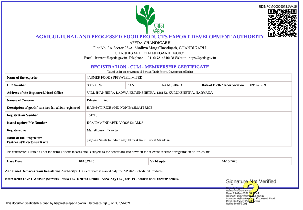 At Jasmer Foods , quality and safety are at the heart of our operations. Our certifications reflect our commitment to delivering pure, reliable, and responsibly processed rice.